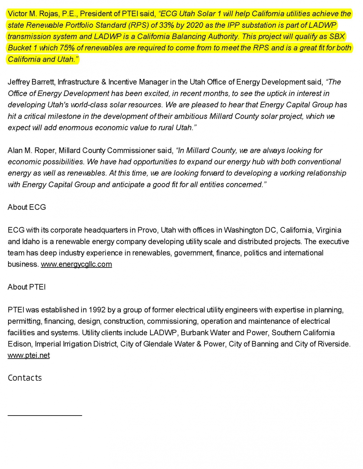 PROVO, Utah--(BUSINESS WIRE)--Energy Capital Group, LLC (ECG) is developing ECG Utah Solar 1 a300 MW solar plant adjacent to the Intermountain Power Plant (IPP). This will be one of the largest solarprojects built and cost an estimated $600 million.
